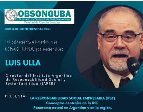 En el marco del ciclo de conferencias organizadas por el Observatorio de las Organizaciones No Gubernamentales de la Universidad de Buenos Aires (OBSONGUBA), su director el Mg. Pablo Marsal junto al equipo del observatorio invitan a la conferencia acerca de “La responsabilidad social empresaria” a cargo de Luis Ulla, director del Instituto Argentino de Responsabilidad Social y Sustentabilidad (IARSE).